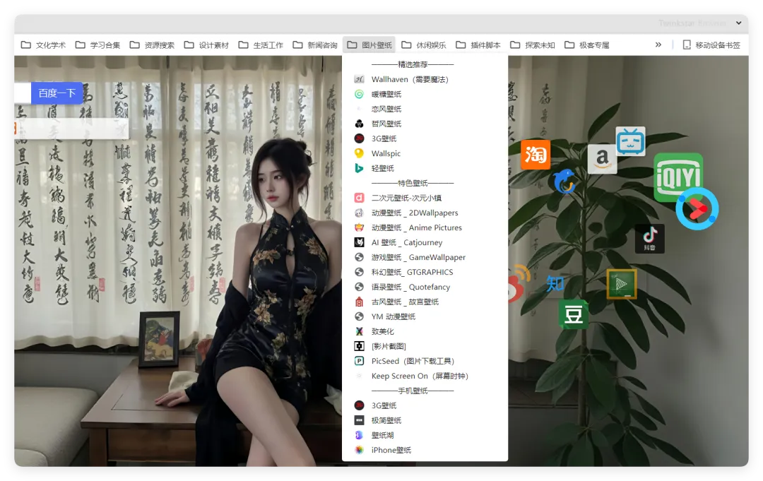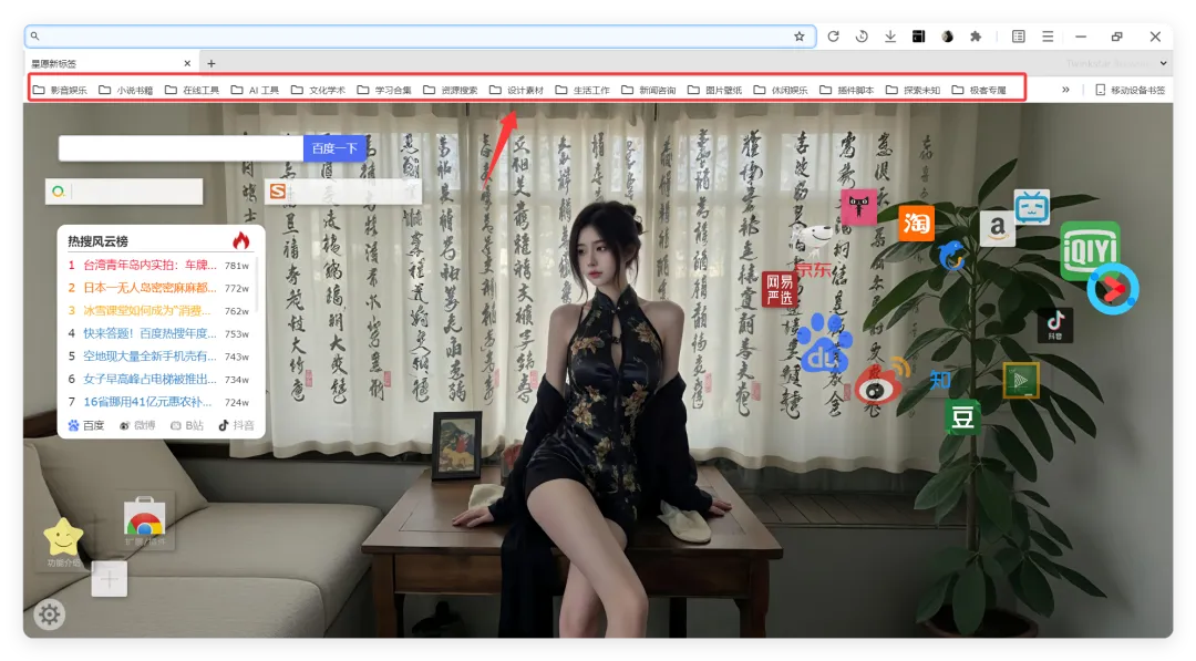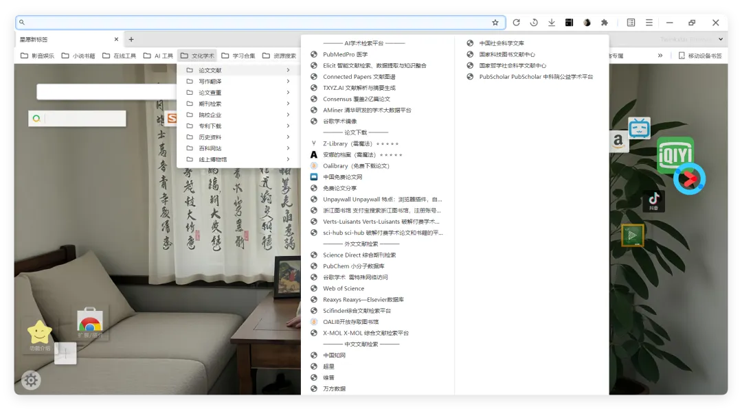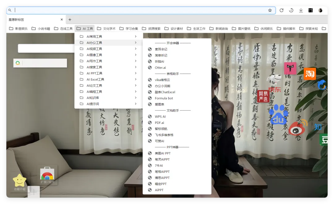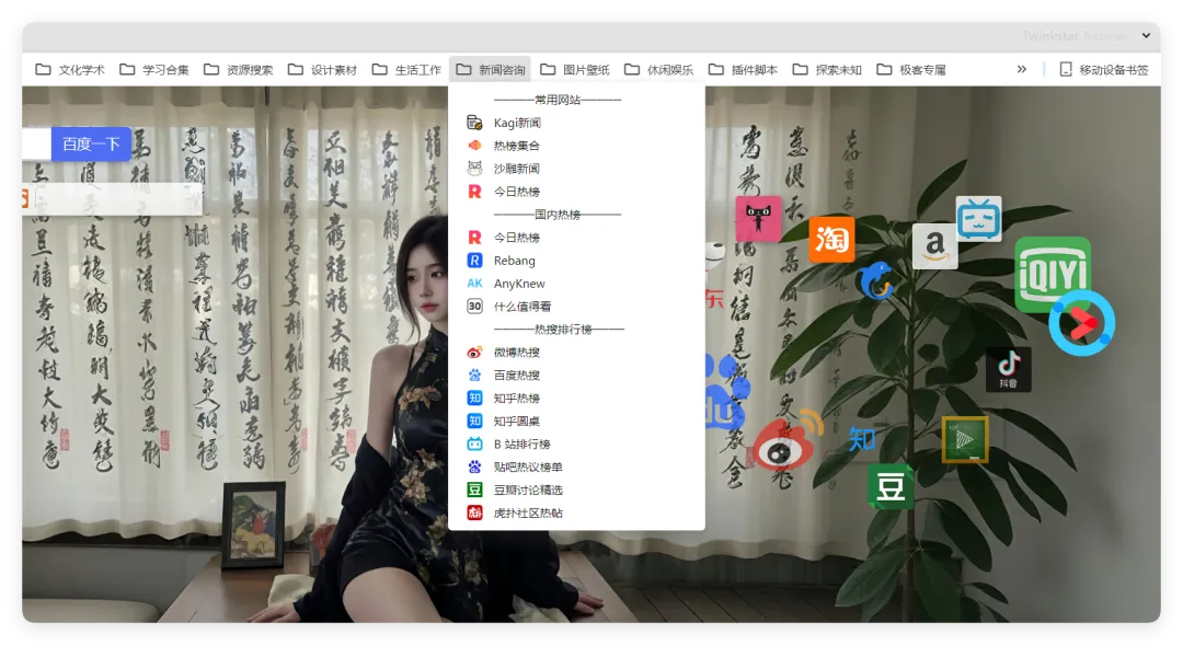 首先是书签类别,新增了插件脚本、学习合集、极客专属三个大类,目前分为了15个大类:在线工具、影音娱乐、资源搜索、AI工具、文化学术、图片壁纸、休闲娱乐、小说书籍、生活工作、新闻资讯、设计素材、插件脚本、学习合集、探索未知、极客专属▼导入浏览器书签栏后