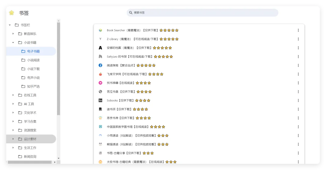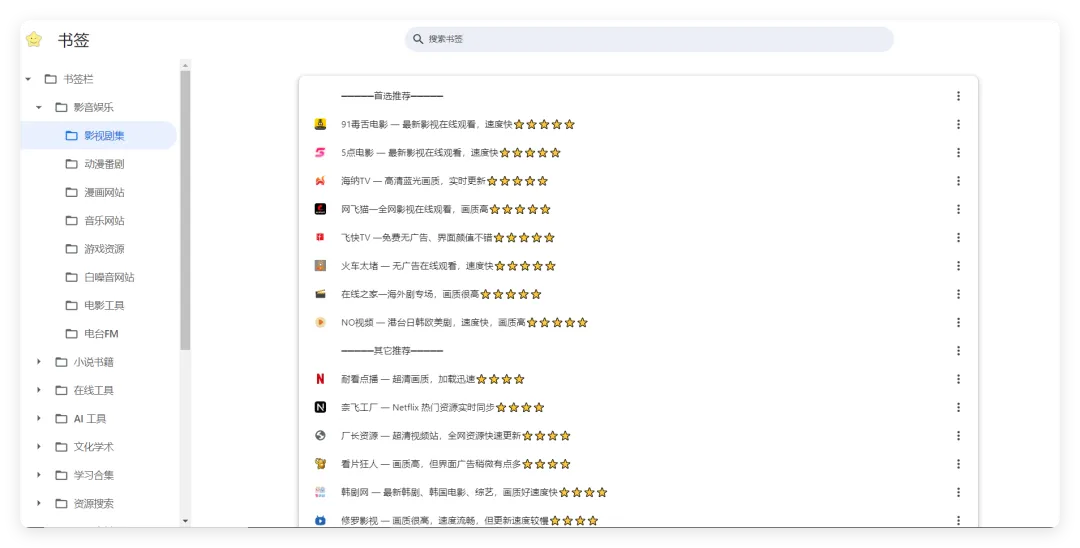 (由于分类比较多,就不一一介绍了,挑几个展示一下)作为大家最常用的娱乐网站,本次更新对极客书签1.0版本的所有观影、追番、音乐网站进行了测评,剔除了失效网站,并进行了星级评分,体验感更佳:导入极客书签后,可以轻松实现看ju、听音乐、追番、看漫画,还有各种游戏资源站,这几个版块是我们娱乐的核心选择,后续会持续重点更新▼ 动漫追番