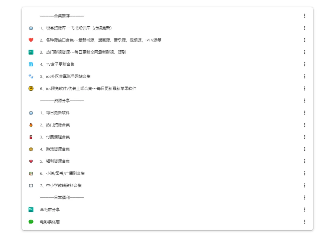 这个新增的版块主要是收录的馆长自行整理里的一些资源合集,价值极高,其中包括了一些我在VIP群里才会发的资源,包括热门软件、付费课程、源接口、中小学教辅资料、游戏资源、ios限免软件/共享账号等等: