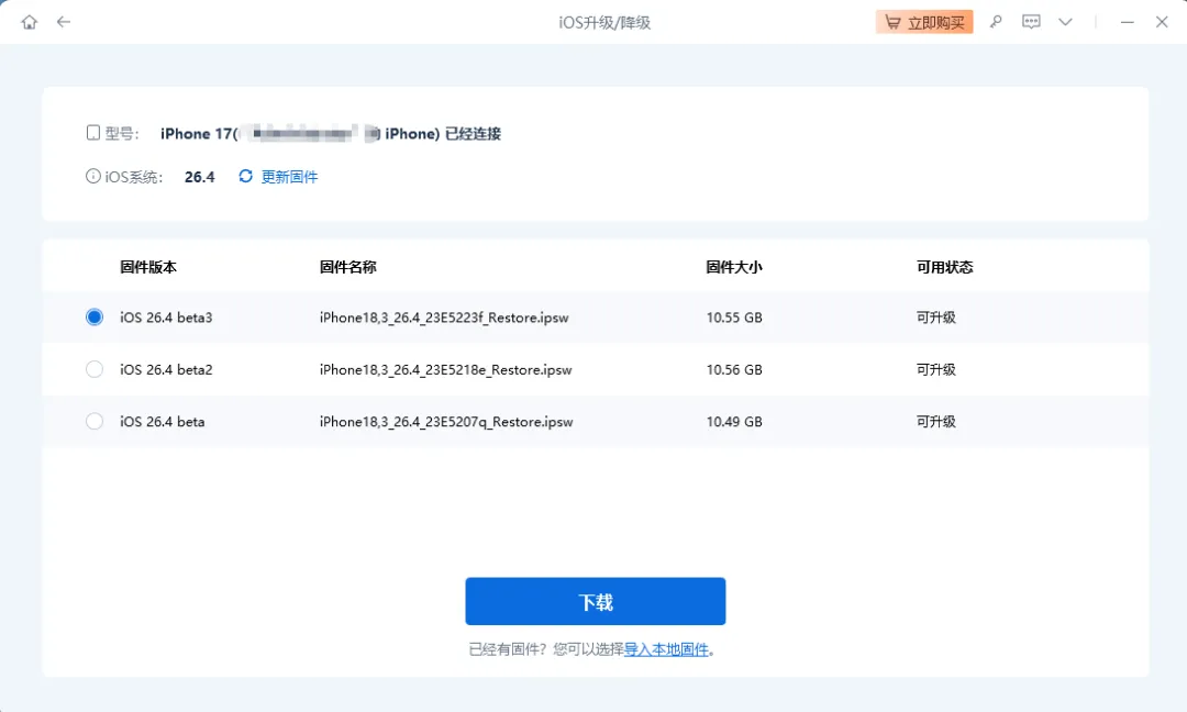 步骤3:选择需要升级的固件版本后,点击【下载】等待开始下载iOS固件