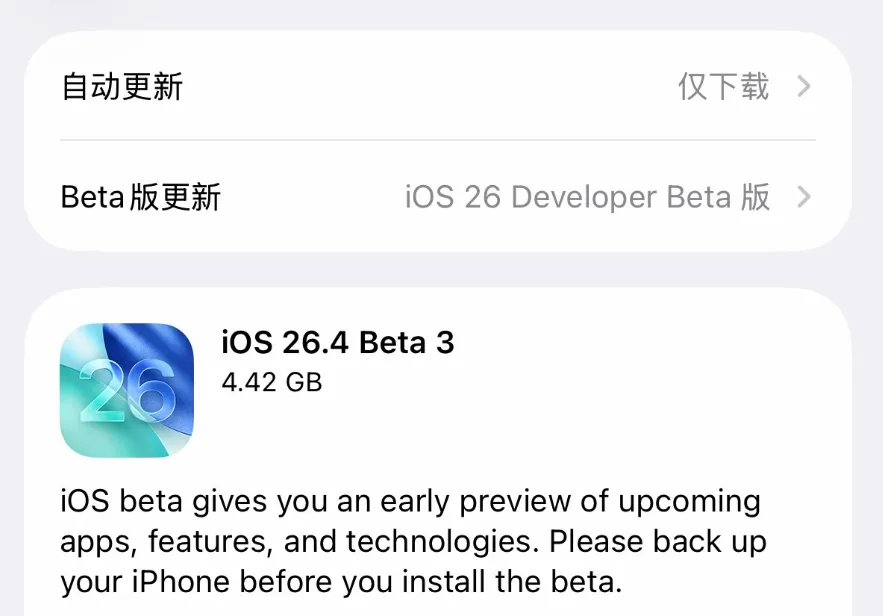 今天凌晨苹果向开发者推送了iOS 26.4 Beta3,距离上个版本刚好一周,更新包不大,但很多果粉的讨论比更新日志热闹多了。