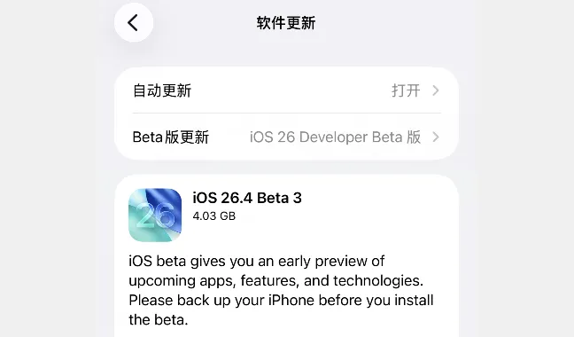 在3月3日凌晨时段,苹果发布 iOS 26.4 beta 3 内测系统,这次更新添加一些符号表情和汉化,但这些功能都出现问题。