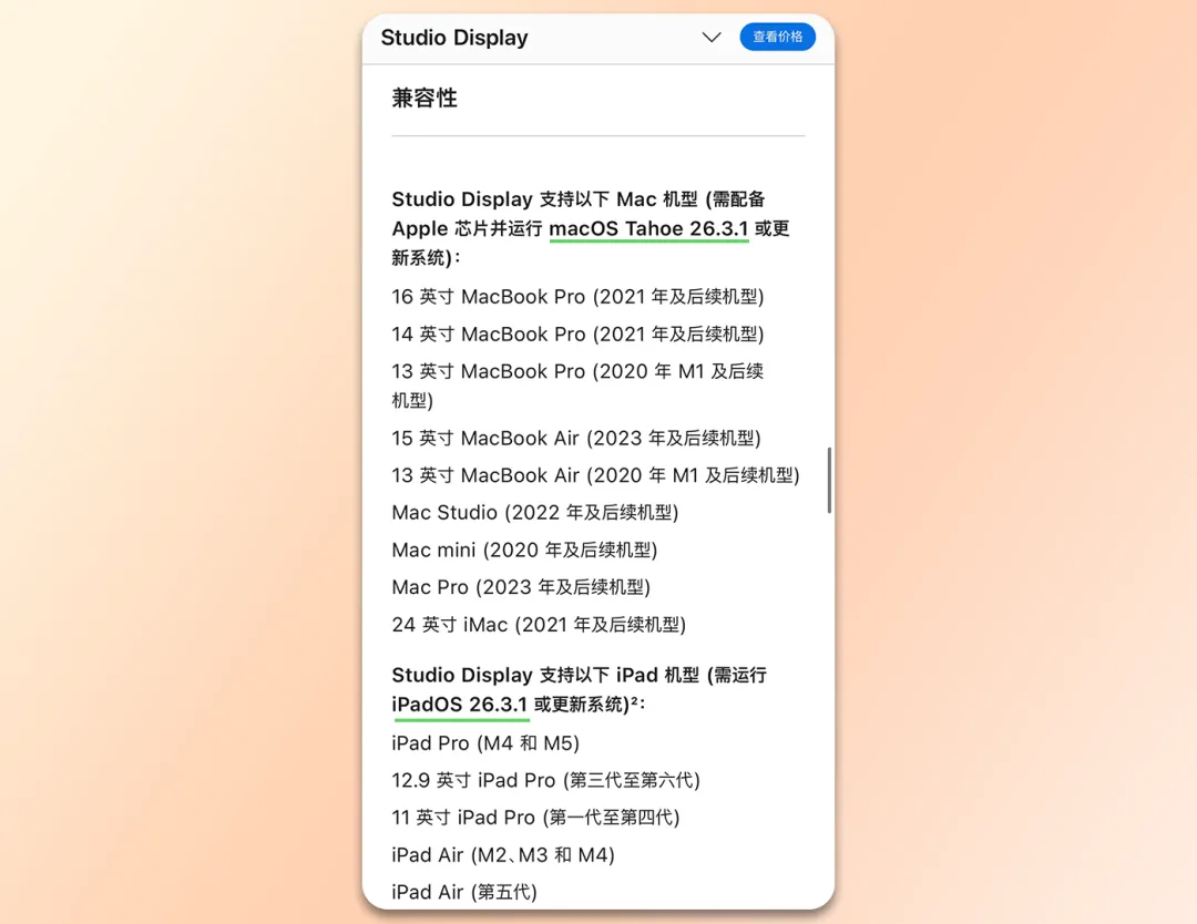 从苹果官网新发布的 Studio Display兼容性了解,需要macOS Tahoe 26.3.1或更高版本的 Mac 机型与iPadOS 26.3.1或更高版本的 iPad 机型兼容。