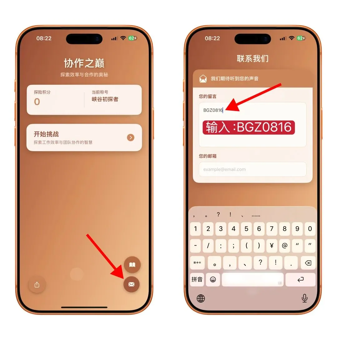 首页右下角信封图标,在留言处输入或粘贴暗号「 BGZ0816 」, 允许网络,确定提交即可