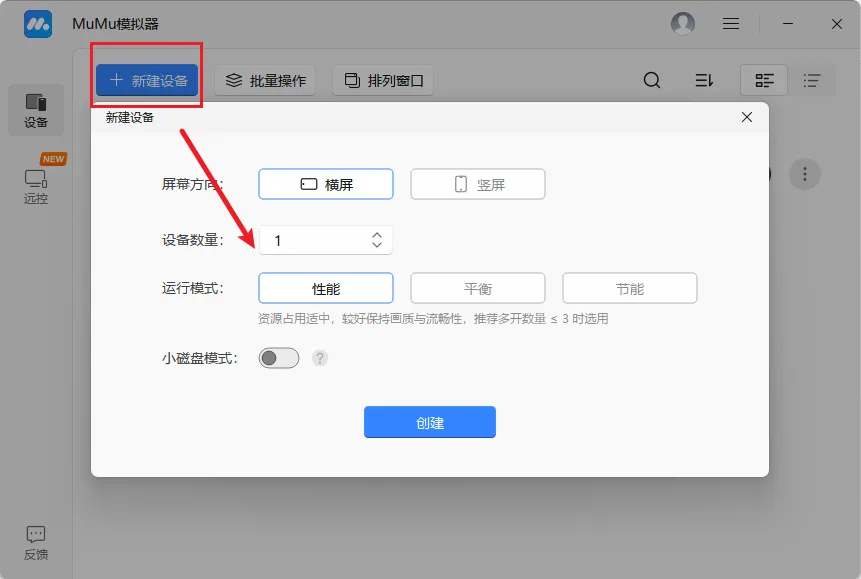 打开软件后,点击新建设备,然后选择适合你的配置和数量,再点击创建即可:
