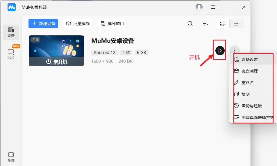 接着你可以直接点击开机按钮,或者修改设置、复制模拟器等等: