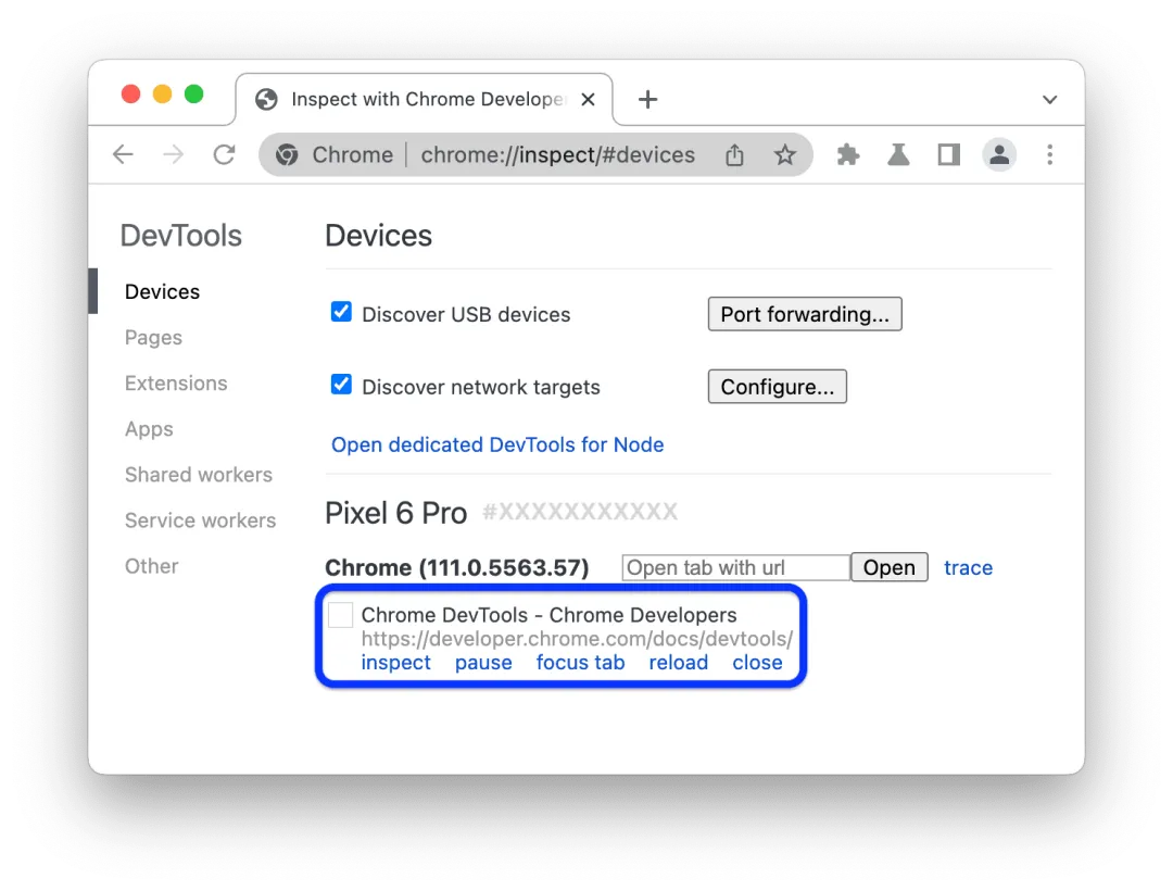 在页面中找到你的设备,下方会列出当前运行的所有WebView页面。点击目标页面下方的"inspect"按钮,即可打开与PC端Chrome开发者工具完全一致的调试界面!