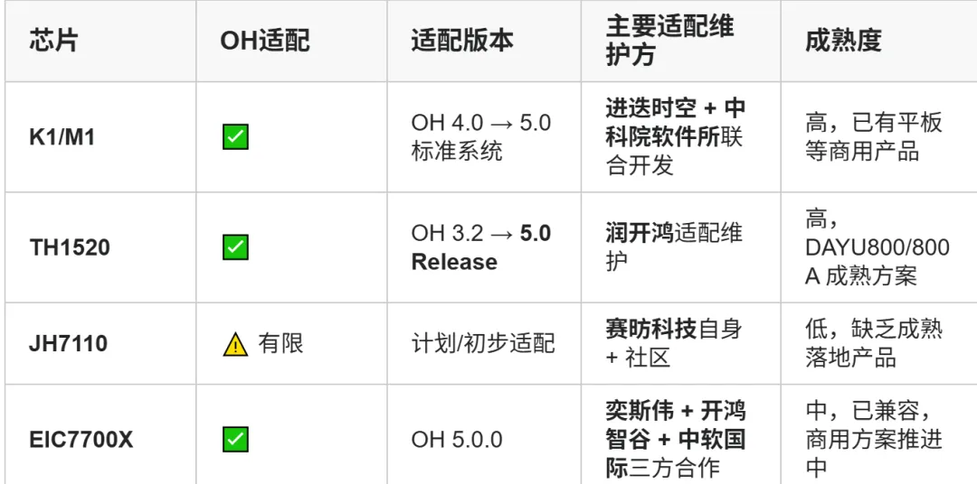 目前已完成或正在推进OpenHarmony适配的RISC-V芯片屈指可数——进迭时空K1/M1适配了OH 5.0标准系统,由进迭时空与中科院软件所联合开发;平头哥曳影TH1520从OH 3.2一路升级到5.0 Release,由润开鸿适配维护;奕斯伟EIC7700X兼容了OH 5.0,由奕斯伟联合开鸿智谷、中软国际三方推进;赛昉科技JH7110还停留在初步适配阶段。