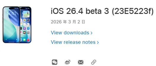 家人们谁懂啊🤯!苹果更新速度堪比番剧连更,3月2日凌晨直接突袭推送iOS 26.4 beta 3(内部版本号23E5223f),距离上一版beta 2仅隔7天,堪称“连夜修复小能手”✨!作为数码+二次元双厨,我连夜冲了实测,全程尖叫预警,既有戳人的小细节,也有避坑小提醒,今天一次性唠个明白,1000字干货+二次元狂喜瞬间,速码不亏👇