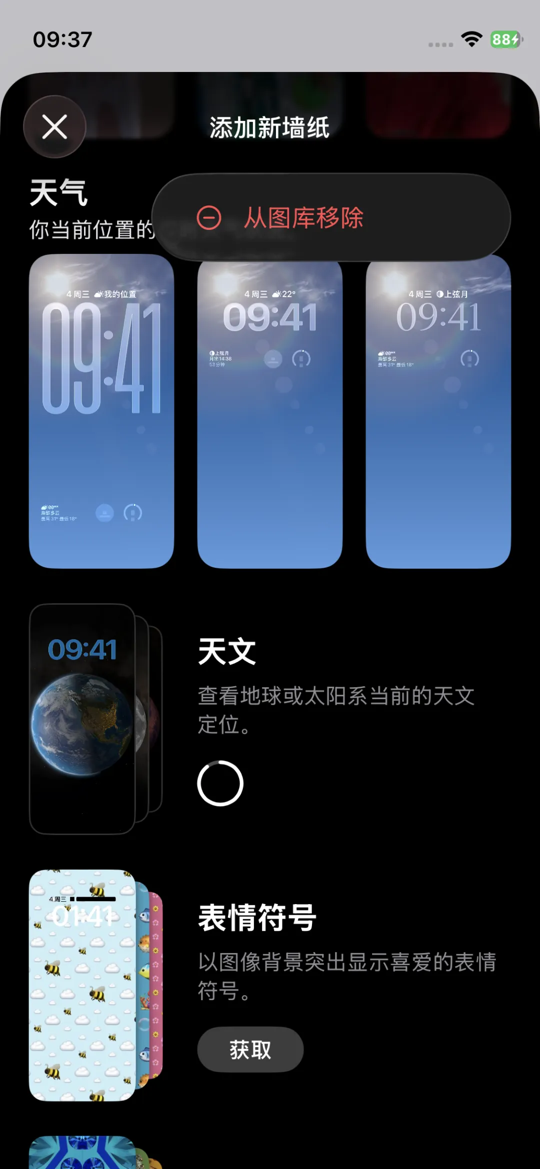 更惊喜的是,壁纸库终于优化啦🥳!支持删除已下载的天气、天文类壁纸,再也不用被冗余壁纸占用空间,二次元党可以放心囤满老婆壁纸,再也不怕存储告急💾!还有控制中心暗色模式适配更完善,夜间刷手机再也不晃眼,熬夜追番也能安心冲~