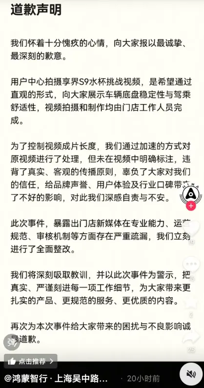 前几天,上海那家鸿蒙智行门店搞了个视频,结果被扒出来是摆拍、造假,最后不得不公开道歉。这事一出,不少人都在问:现在卖车都得靠演戏了吗?咱今天不点名、不踩谁,就聊聊这个事背后反映出的几个真问题。首先,这个行业太卷了。说白了,现在的新能源车市场,不是“你追我赶”,而是“你死我活”。新品牌一个接一个冒出来,老品牌拼命转型,连手机厂商都来造车。结果呢?产品同质化严重,技术拉不开差距,价格战打到地板价,大家只能在营销上“整活”。可问题来了——当正经宣传讲不清优势,有些门店就开始走歪路。比如编故事、摆场景、雇人排队、P销量图……好像不搞点“视觉冲击”,消费者就不信你有多牛。但这种操作,短期可能吸眼球,长期只会砸招牌。这次造假视频翻车,就是个警钟。更让人头疼的是,同行之间的关系也越来越拧巴。本来良性竞争能推动行业进步,但现在不少地方变成了“你不好我才好”。有的品牌互相拆台,有的经销商暗中抹黑对手,甚至出现“举报专业户”——自己卖不动,就盯着别人找茬。这种内耗,消耗的是整个行业的公信力。消费者不是傻子。你今天糊弄他一次,明天他就再也不信你了。尤其买车这种大件,人家看的是实打实的服务、靠谱的售后、透明的价格。不是看你门店里有没有网红打卡、短视频里有没有“泪目剧情”。说到底,中国汽车产业走到今天不容易。技术、产能、供应链,咱们都有了世界级水平。可如果风气坏了,再好的底子也经不起折腾。与其花心思编剧本,不如把展厅的灯擦亮点,把销售的话术改实在点,把用户的反馈真听进去点。这个事,表面是个别门店作假,根子却是行业焦虑下的集体失序。希望这次道歉不是终点,而是一个提醒:别让内卷变成内鬼,别让竞争变成互害。咱中国车,值得更好的口碑,而不是靠演出来的热度。