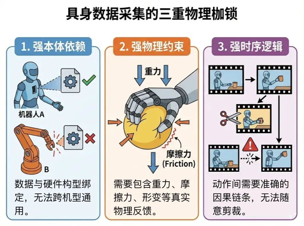 这一组数据标志着一个分水岭:数据采集开始走出实验室,演变为集中在大城市的“新基建”集群。随着硬件层面的规模化铺开,数据采集面临的难题也越发明显:不同于唾手可得的互联网文本,具身数据在采集上面临着三重“物理枷锁”。