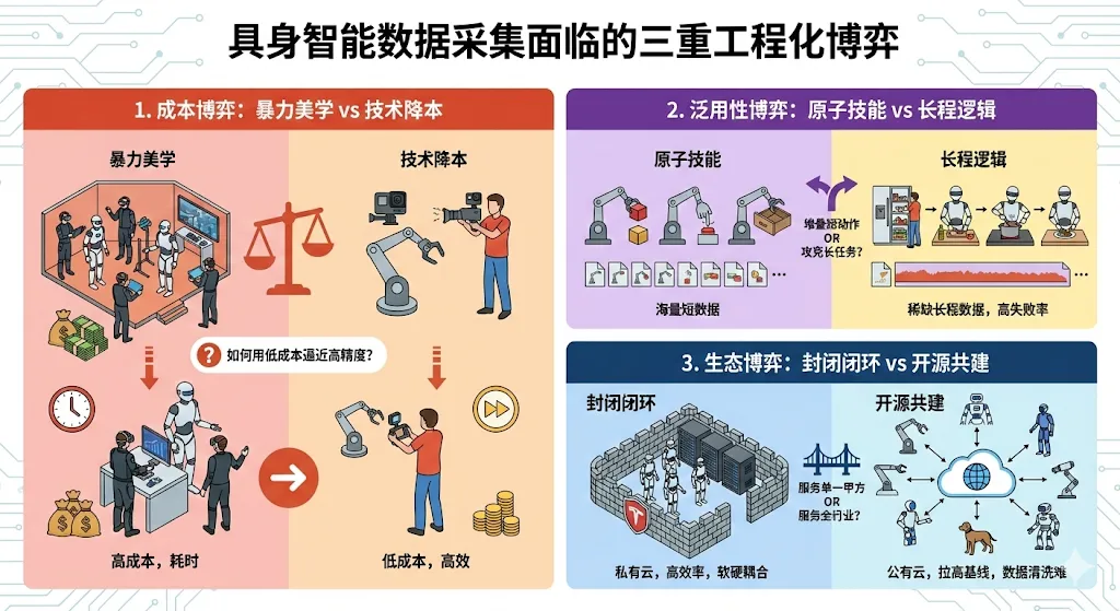 这是战略上的博弈。封闭模式(如特斯拉)能确保数据格式统一、软硬高度耦合,效率极高;而开源模式(如 Open X-Embodiment)虽然面临数据清洗难、标准不一的问题,但能通过生态力量快速拉高行业基线。对于数据工厂而言,是服务于单一甲方的“私有云”,还是做服务于全行业的“公有云”,决定了其商业模式的上限。