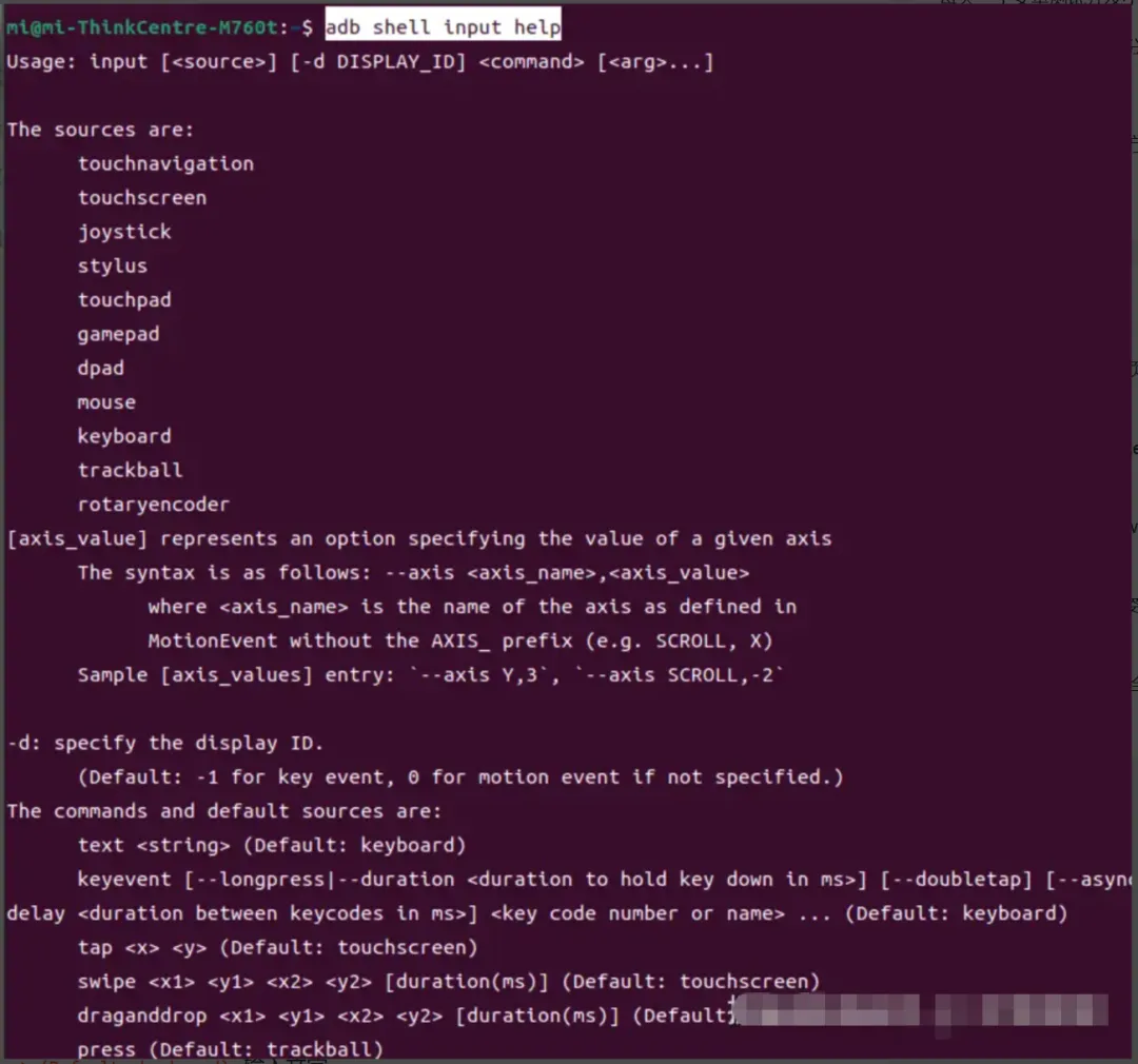 swipe <x1> <y1> <x2> <y2> [duration(ms)] (Default: touchscreen) 滑动;