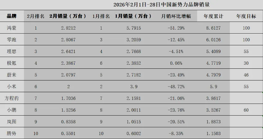 春节后的第一份成绩单来了!2月新势力销量榜大洗牌,有人逆势上涨,有人环比腰斩,快来看看你的爱车品牌排第几?