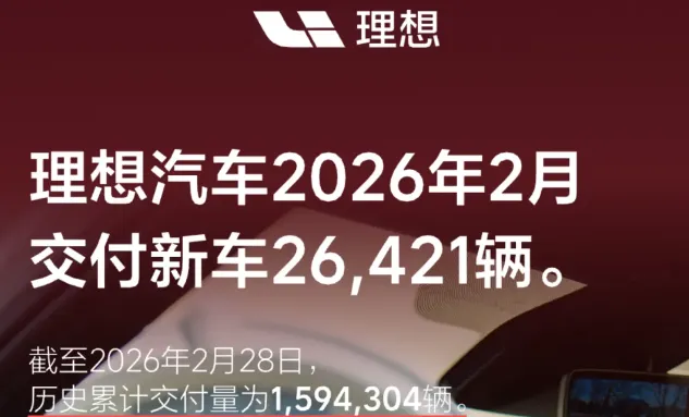 理想汽车:26421辆(环比降幅最小,仅4.5%)