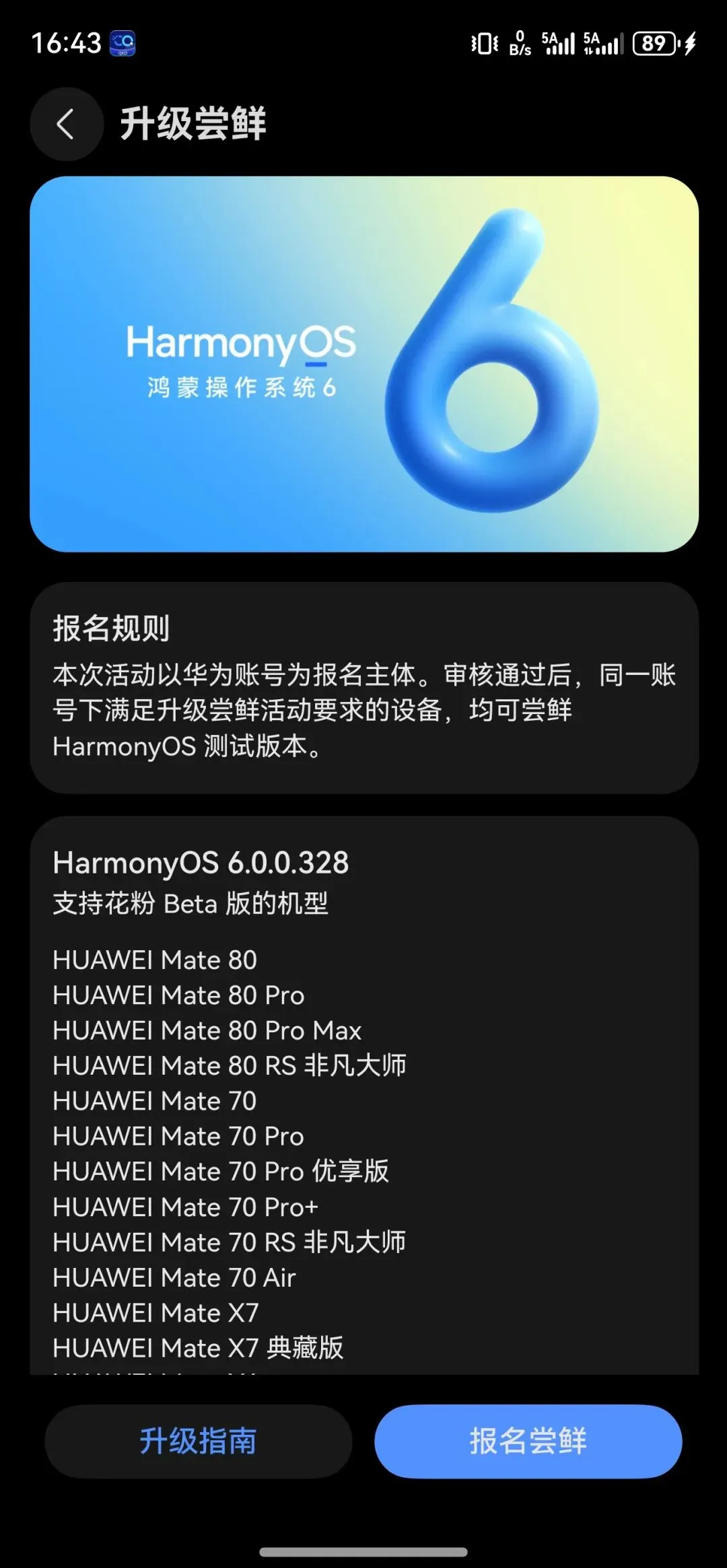 就在刚才,我自己当主力机用的华为mate 80 ProMax,点了一下更新,突然出现“报名尝鲜”,鸿蒙6.0.0328系统闪亮登场!赶紧报名参加,不过还是给大家花粉提醒,bate版本哦!