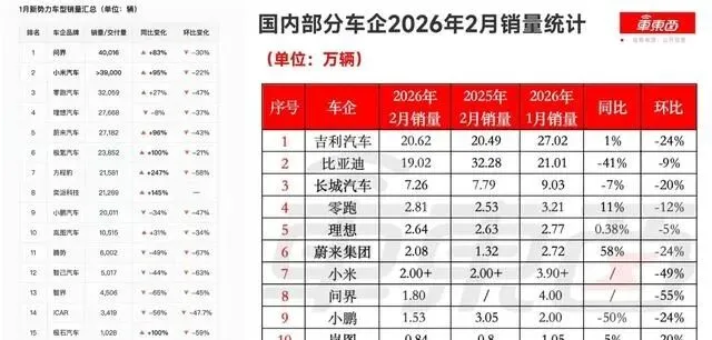 要说对比才有意思,咱把问界跟几个热门新势力放一块儿瞧瞧。小米汽车2月卖了2万多台,听着不少吧?可上个月人家可是奔着4万去了,这一算环比掉了快五成;蔚来2月交了20797台,比1月少了两成多;小鹏更实在,15256台的成绩环比也滑了快四分之一;就连势头挺猛的零跑,28067台的销量也比1月少了12%左右。这么一圈看下来,问界45%的跌幅确实比蔚来、小鹏他们大点儿,但比小米还是强点。再说了,人家1月基数摆在那儿呢——4万多台的销量,搁谁身上,基数越高,淡季摔得看起来就越狠不是?