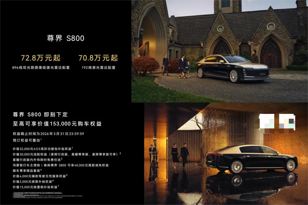 搭载新一代激光雷达的尊界S800,已于2026年3月4日开启预定,建议零售价72.8万元起,即刻下定,至高可享价值153,000元购车权益,权益截止时间为2026年3月31日23:59:59。