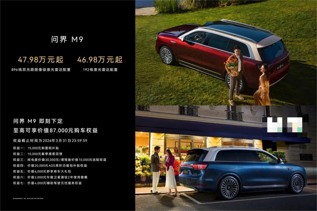 搭载全新一代激光雷达的问界M9,已于2026年3月4日开启预定,建议零售价47.98万元起,即刻下定,至高可享价值87,000元购车权益,权益截止时间为2026年3月31日23:59:59。