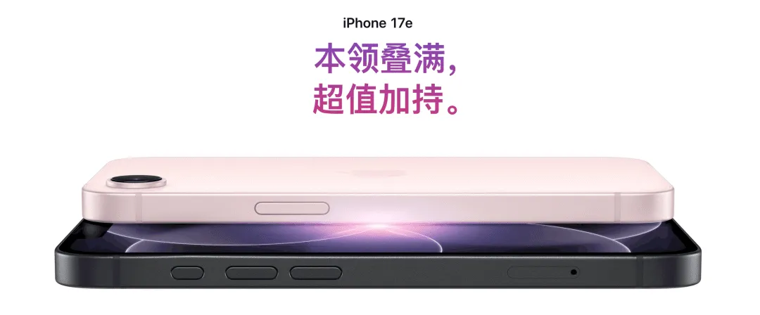 iPhone 17e:一款注重性价比的中端机型,搭载 A19 芯片,支持 MagSafe 磁吸充电、更快的充电速度、陶瓷护盾 2(更耐用)、6.1 英寸 Super Retina XDR 显示屏、48MP 融合相机(支持 2 倍光学变焦)。起始存储翻倍至 256GB,提供黑色、白色和新款粉色。起售价 4499 元。