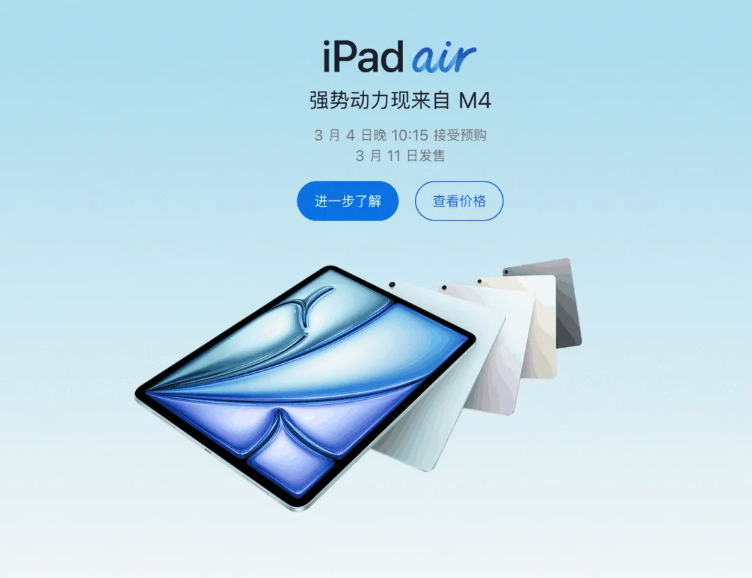 iPad Air(搭载 M4 芯片):11 英寸和 13 英寸两种尺寸,比 M3 快 30%,配备 12GB RAM(增加 50%)、苹果自研 C1X 5G 调制解调器、Wi-Fi 7 支持。起始容量 128GB,11 英寸起售价 4799 元,13 英寸 6499 元。