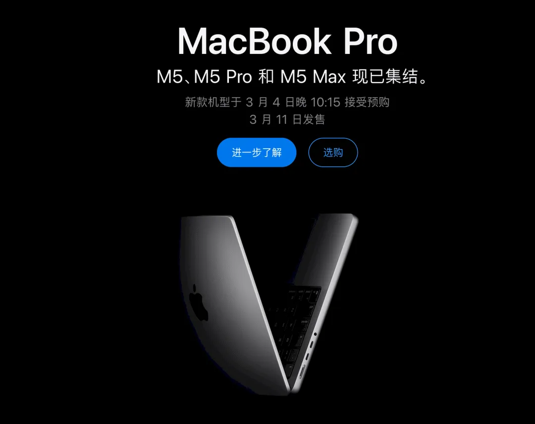 MacBook Pro(搭载 M5 Pro 和 M5 Max 芯片):14 英寸和 16 英寸专业级型号,针对高强度工作流优化,M5 Pro/Max 芯片提供更快 AI 处理和图形性能。起始存储 1TB(无 512GB 选项)。14 英寸 M5 Pro 起售价 17999 元,16 英寸 M5 Pro 21999 元;M5 Max 版本更高(14 英寸 29999 元起)。