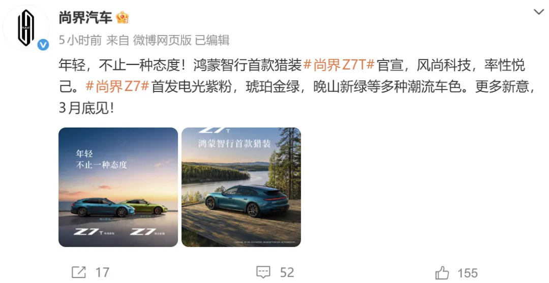 3月4日,在鸿蒙智行技术发布会上,余承东正式官宣,将推出鸿蒙智行首款猎装车型——尚界Z7T。余承东在发布会上表示,在开发尚界Z7轿跑的同时同步开发了尚界Z7T,尚界Z7T与尚界Z7轿跑同台亮相,两车将形成“双车矩阵”产品布局。目前官方已对外发布尚界Z7T官图,新车将在本月底正式首发亮相。
