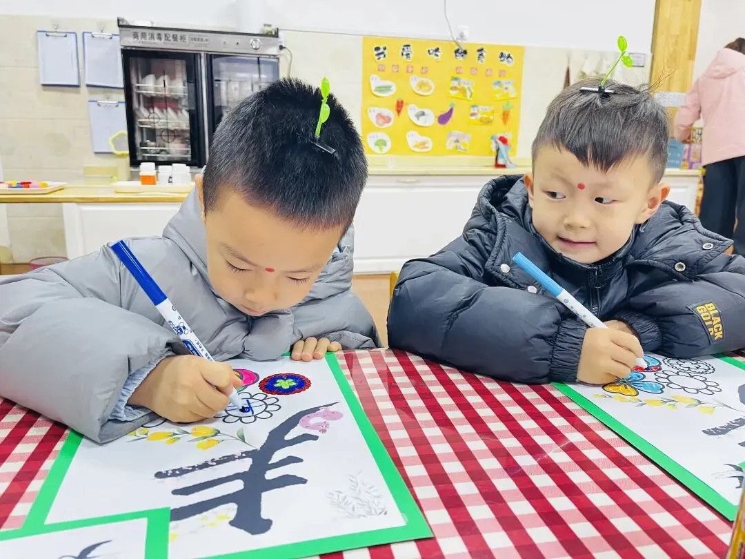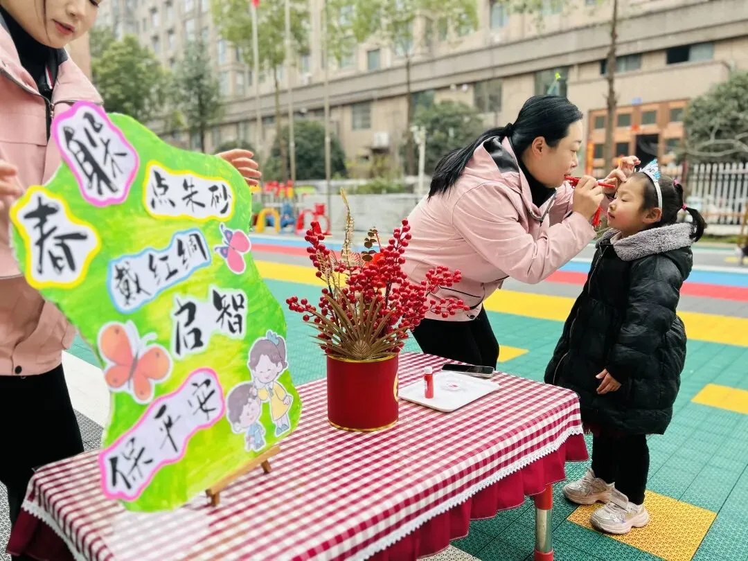 “躲春”的仪式,藏着最温柔的祝福。老师们轻点朱砂在孩子们的额头,一抹朱红,不仅是迎春纳福的美好寓意,更象征着点亮智慧的明灯。愿孩子们在新的一年里,眼有星辰,心有山海,在知识的世界里自在遨游。