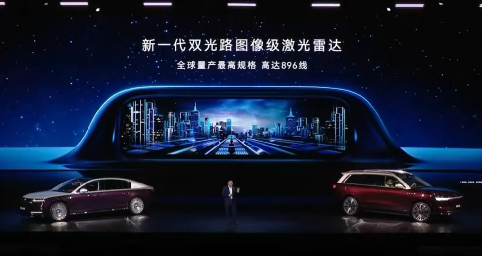 本次发布会的一大看点是全球量产最高规格的896 线图像级激光雷达,采用华为首创双光路架构,广角与长焦一体协同,彻底解决传统雷达 “看远不看广、看广不看细” 的行业痛点。其成像分辨率较 192 线雷达提升 4 倍,实现从 “点云级” 到图像级感知的跨越,点云更密、识别更准,相比主流 512 线雷达形成明显技术代差。同时搭载钢化玻璃视窗,硬度与耐久性大幅提升,强光、逆光、雨雾天抗干扰能力更强。