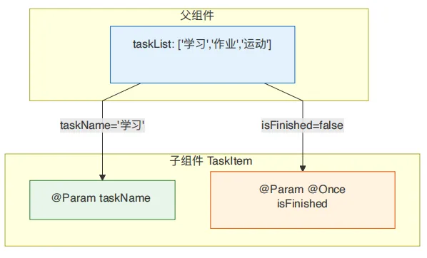 // 子组件接收@Componentstruct ChildComponent { @Param 变量名:类型; // 只读 @Param @Once 变量名:类型; // 可修改(仅初始化一次)}