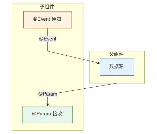 @Param 让⼦组件可以接收⽗组件传⼊的数据。实现⽗→⼦的单向数据流。