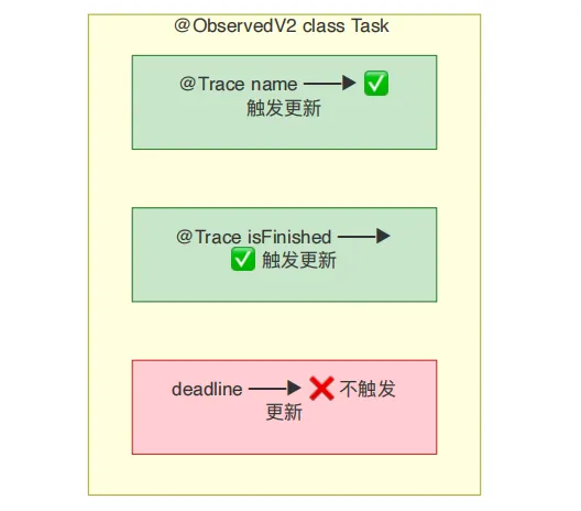 @ObservedV2class 类名 { @Trace 属性名:类型 = 初始值; // 追踪这个属性 属性名:类型 = 初始值; // 不追踪}