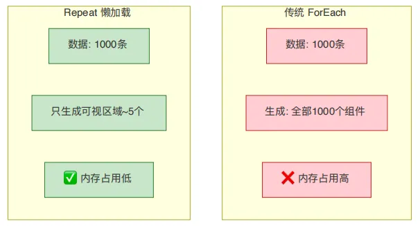 // ⾮懒加载Repeat(数组).each((item) => {// 渲染每个item})// 懒加载Repeat(数组) .lazy(true) .each((item) => {// 渲染 })