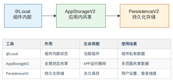 九、AppStorageV2 + PersistenceV2:全局存储9.1 存储⼯具对⽐