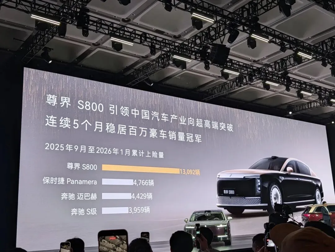 尊界S800已经在超豪华市场站稳了脚跟,2025年9月 - 2026年1月上险量1.3万台,单月平均在2000台以上。