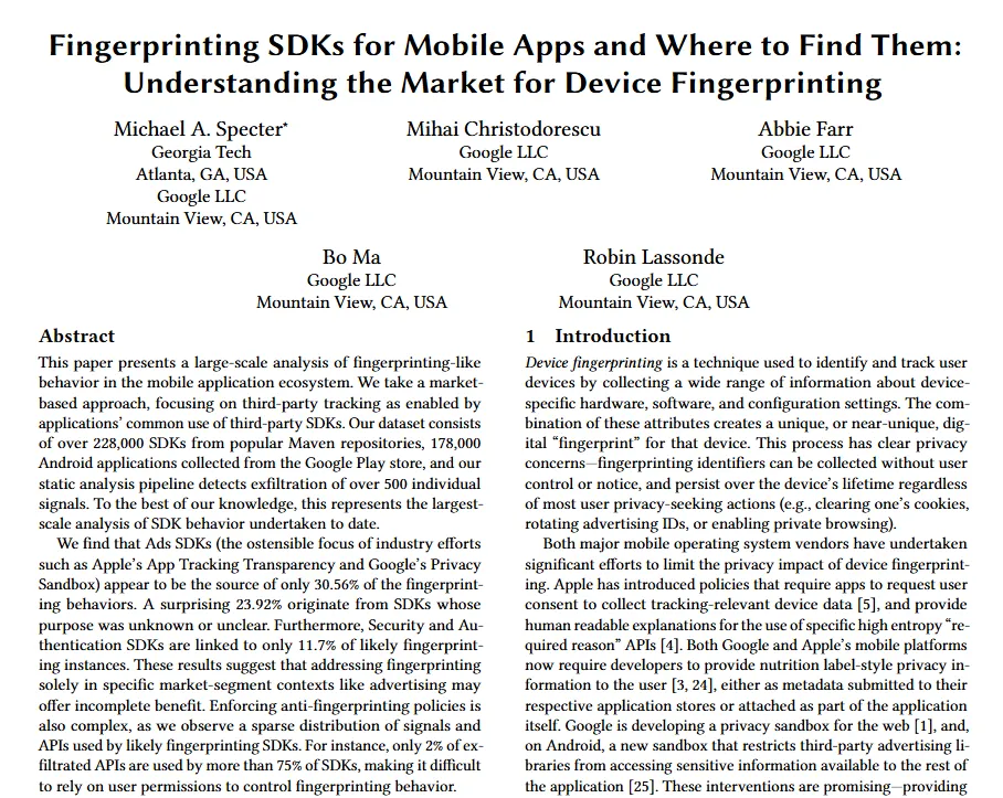 来自佐治亚理工和Google的联合研究,2025年11月发在ACM CCS。核心问题用一句话概括:Android生态中有多少SDK在做设备指纹追踪,它们是谁,用于什么目的,影响了多少用户?