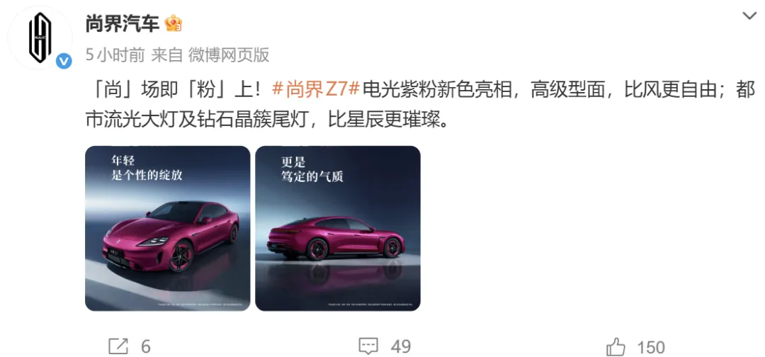 本次发布会上,官方发布了尚界Z7两款全新的外观配色,分别为电光紫粉和琥珀金绿。同时,官方还首次公布了尚界Z7的内饰设计。尚界Z7车内提供液晶仪表盘、悬浮式中控屏、副驾驶娱乐屏以及HUD抬头显示。其中,副驾采用了创新的储物空间设计,可以放置用户喜爱的毛绒手办和玩,给人非常年轻时尚的感觉。此外,中控屏搭载首发的随动四维屏,支持前后伸缩和左右旋转、智能迎宾等功能,为用户提供更多的情绪价值。按计划,新车将在今年一季度推出,上市后将与新一代小米SU7展开竞争。