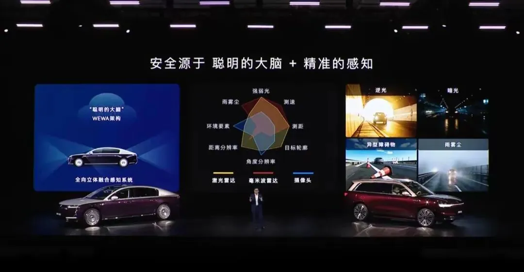 发布会上靳总还贴心放了对比图,把激光雷达、毫米波雷达、视觉摄像头的优势讲得明明白白: