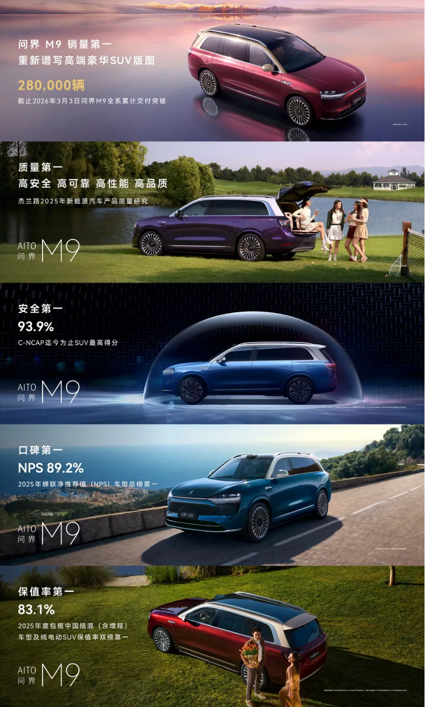 如果说尊界S800代表的是鸿蒙智行向超豪华市场发起的冲锋,那么问界M9则早已在高端豪华SUV赛道上完成了一轮"降维打击"。累计交付突破28万辆,荣膺2025年50万级豪华SUV全年销量冠军;C-NCAP测试中创下SUV历史最高得分93.9%;杰兰路新能源汽车产品质量榜单排名第一;2025年净推荐值车型总榜第一;并包揽2025年度中国插混及纯电动SUV保值率双榜第一。