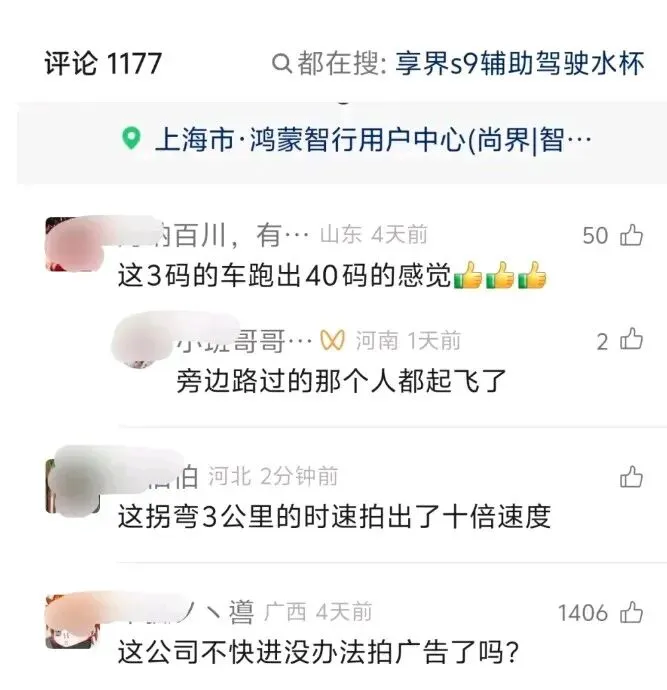 其中一段视频题为:《享界S9T挑战驾驶水杯不倒》,发布者为“鸿蒙智行·上海吴中路用户中心”。