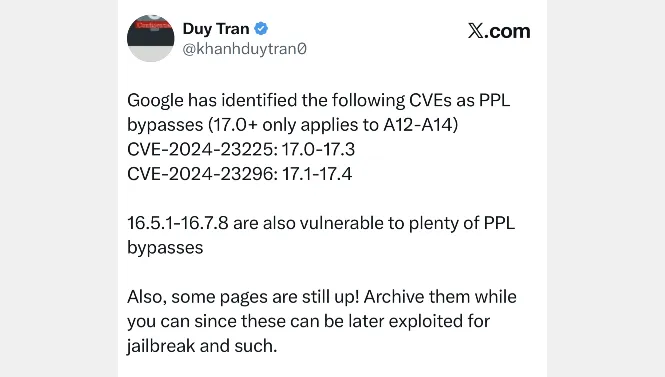 在3月4日上午时段,Duy Tran 大佬在 X 推特发布一条与越狱有关的消息,确定 CVE-2024-23225 和 CVE-2024-23296 漏洞为 PPL 绕过,可能会被利用与越狱,只要有 PPL 绕过,肯定对越狱有很大帮助。
