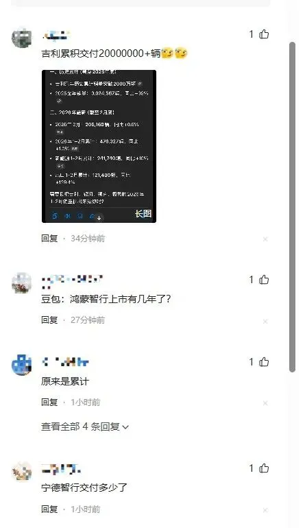 在相关文章的评论区,称赞的声音不少,但也出现一些质疑和嘲讽的声音。有的网友表示:吉利累计交付了2000万+台汽车。有的网友调侃:原来是累计啊。更有网友笑谈:宁德智行交付了多少?