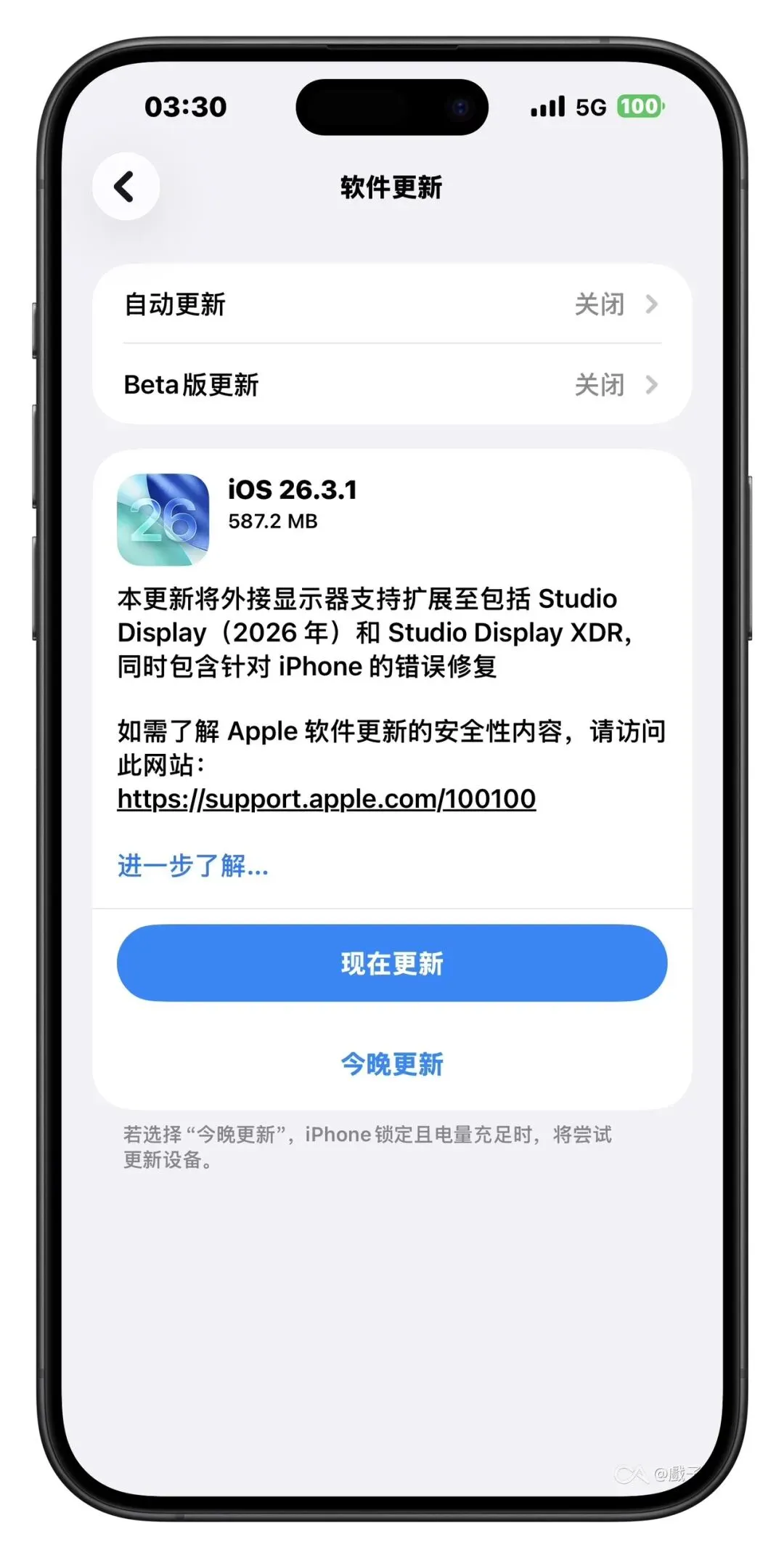 今天凌晨苹果发布了 iOS 26.3.1 正式版系统,版本号为 23D8133 增加了对新款Studio Display和Studio Display XDR的支持,并包含一些错误修复。