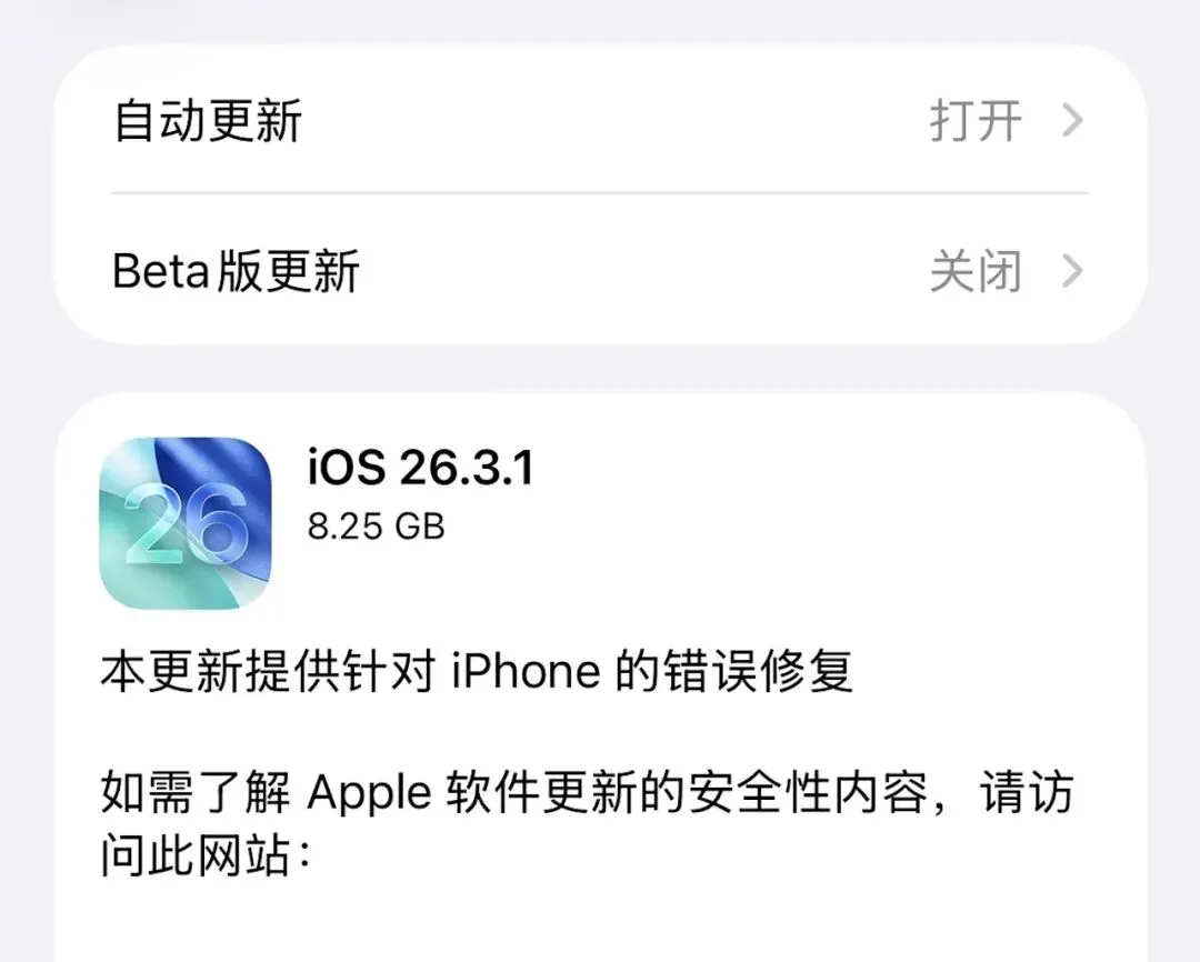 苹果紧急更新,iOS 26.3.1 正式版来了