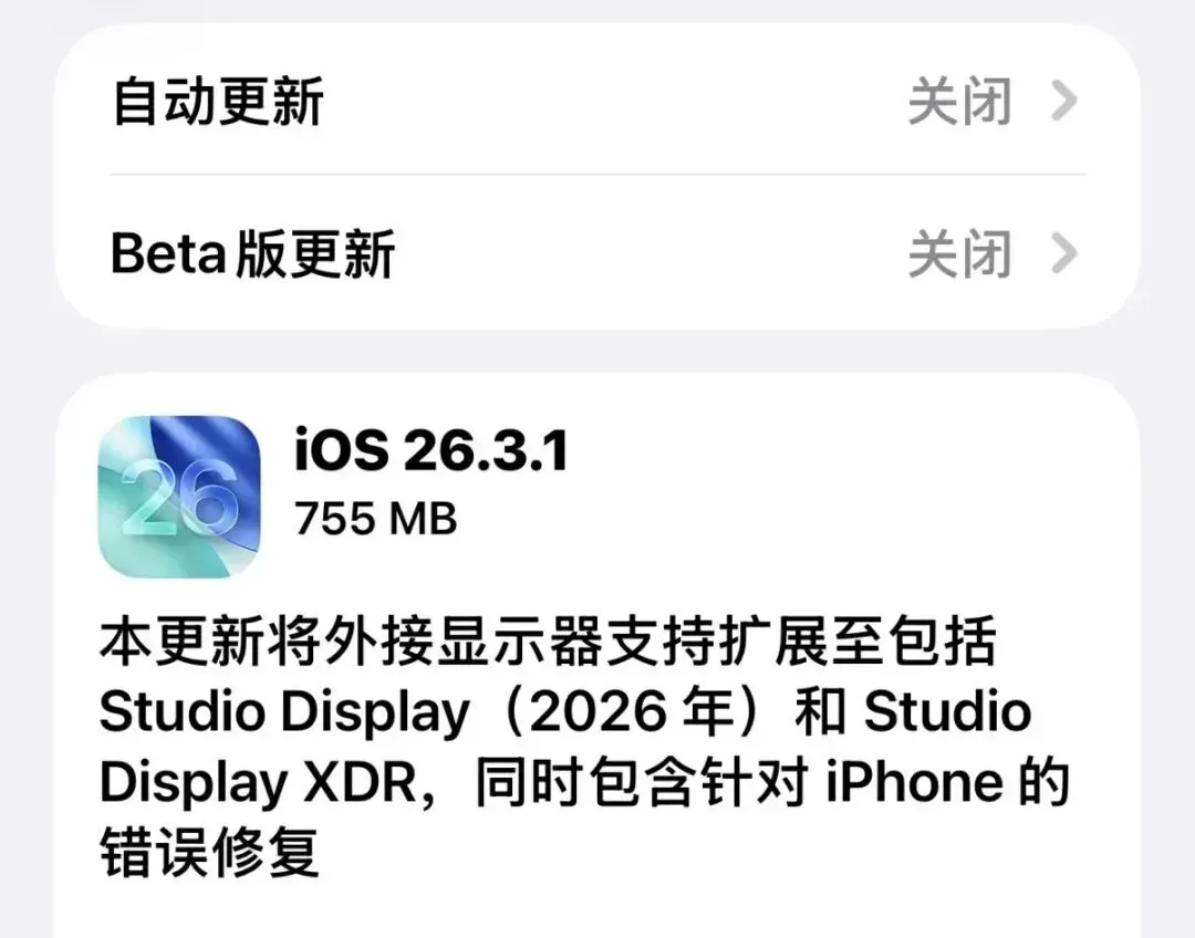 iOS 26.3.1(2026-03-05推送)是纯修复+安全+新机适配版本,无新功能。