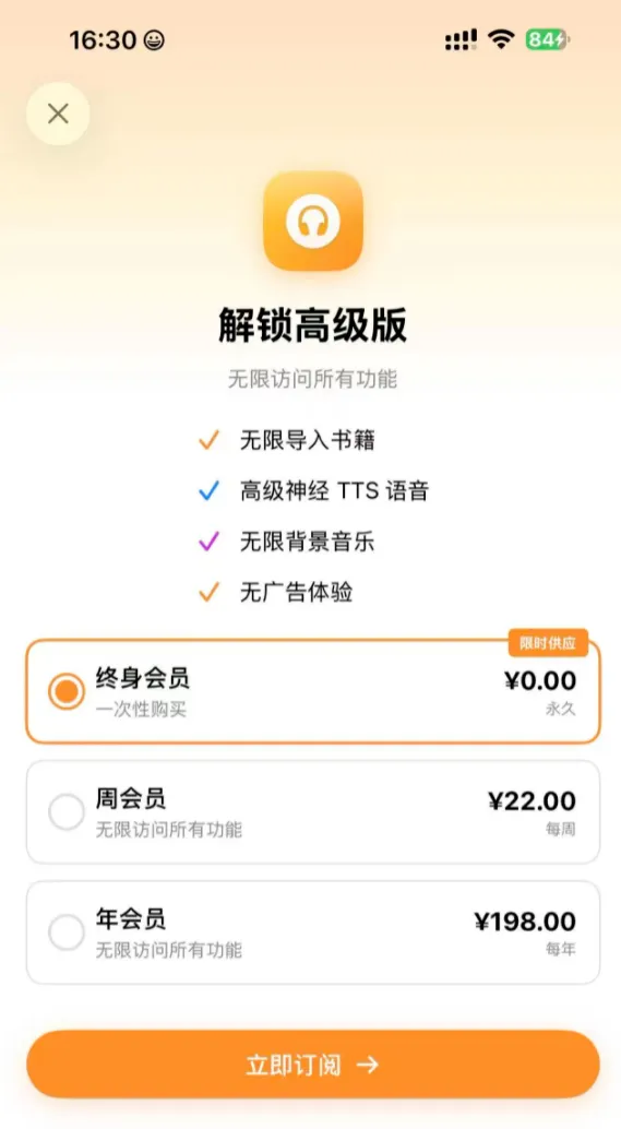打开后,点击左上角皇冠图标,终身会员显示0.00,说明活动还在,如果不是说明活动结束,等待下次活动开始!
