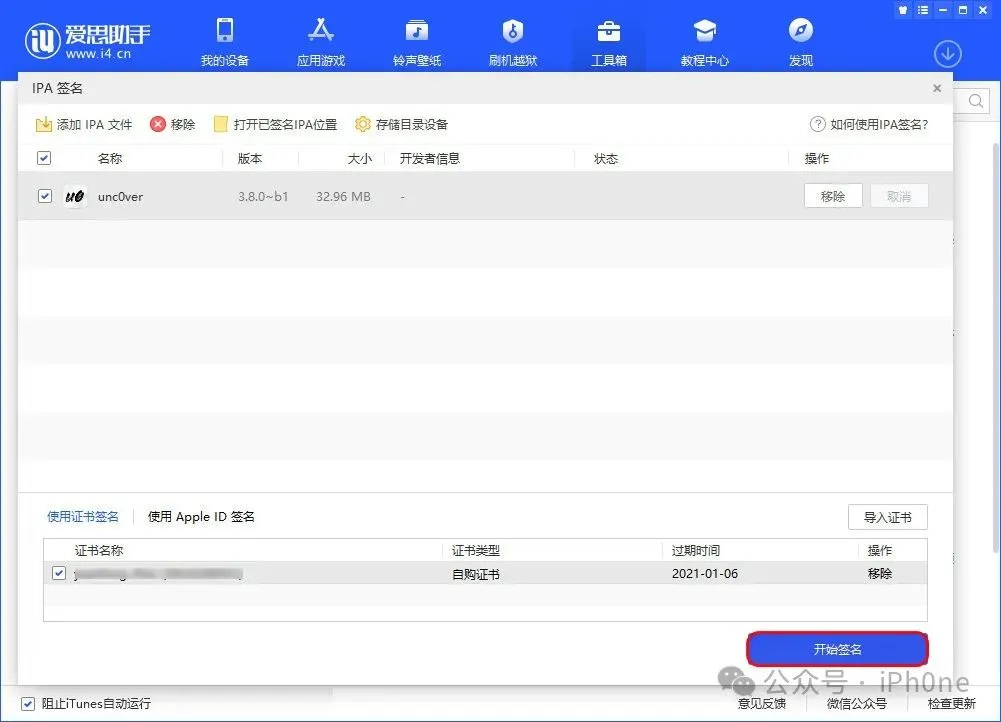 用电脑版爱思助手签名安装、或用有效证书自签安装。