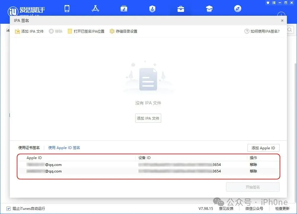 选择“使用 Apple ID 签名 - 添加 Apple ID”,随后输入用于签名的 Apple ID、密码并选择或输入对应设备的设备标识(指签名后 IPA 文件要安装的设备);检查无误后点击“确定”。建议操作前需要将 iOS 设备连接至爱思助手,并保证可以读出“设备标识”,如果未连接设备,需要手动输入设备标识。