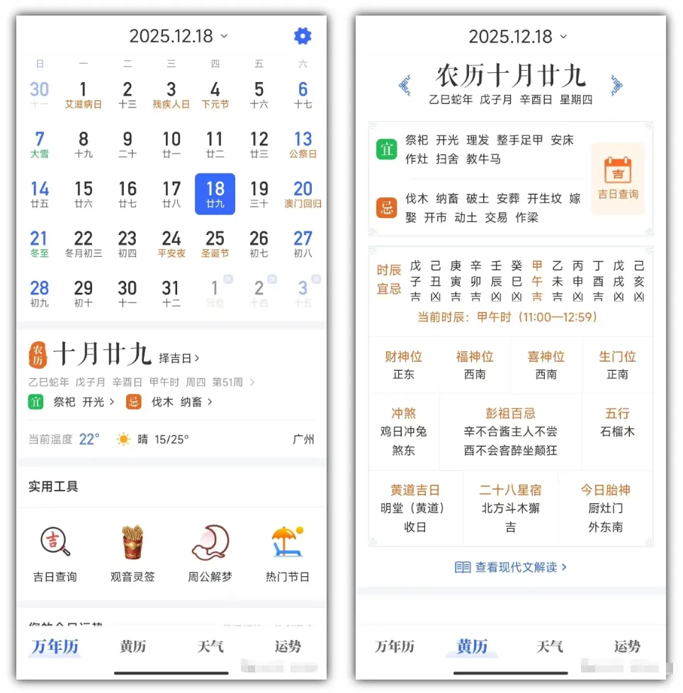 核心的黄历功能更是亮点满满,精准标注每日宜、忌、时需,还有财神位、黄道吉日等详细信息,对看重传统讲究的朋友格外友好。尤其在广东地区,不管是办事选吉时,还是搬家、动土等事宜看讲究,吉时、宜忌一眼看清,再也不用担心错过合适时辰。